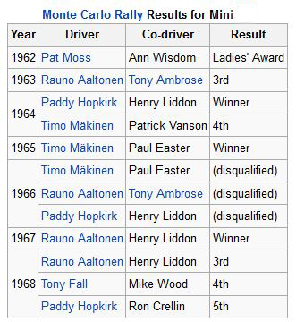 The Mini Cooper S won the Monte Carlo Rally in 1964, 1965 and 1967. Minis were initially placed first, second and third in the 1966 rally as well, but were disqualified after a controversial decision by the French judges. The disqualification related to the use of a variable resistance headlamp dimming circuit in place of a dual-filament lamp. It should be noted that the Citroën DS that was eventually awarded first place had illegal white headlamps but escaped disqualification. The driver of the Citroën, Pauli Toivonen, was reluctant to accept the trophy and vowed that he would never race for Citroën again. BMC probably received more publicity from the disqualification than they would have gained from a victory.